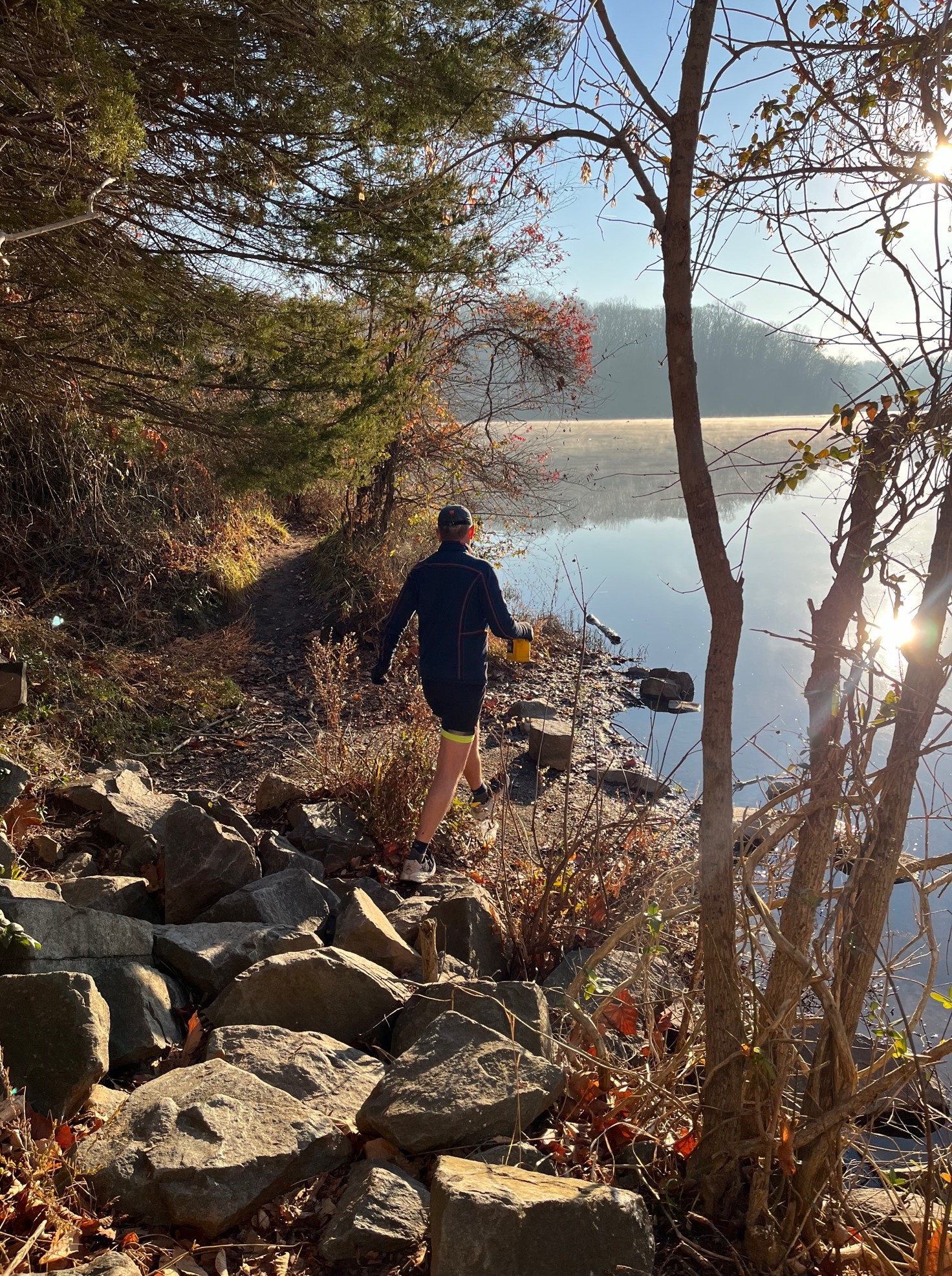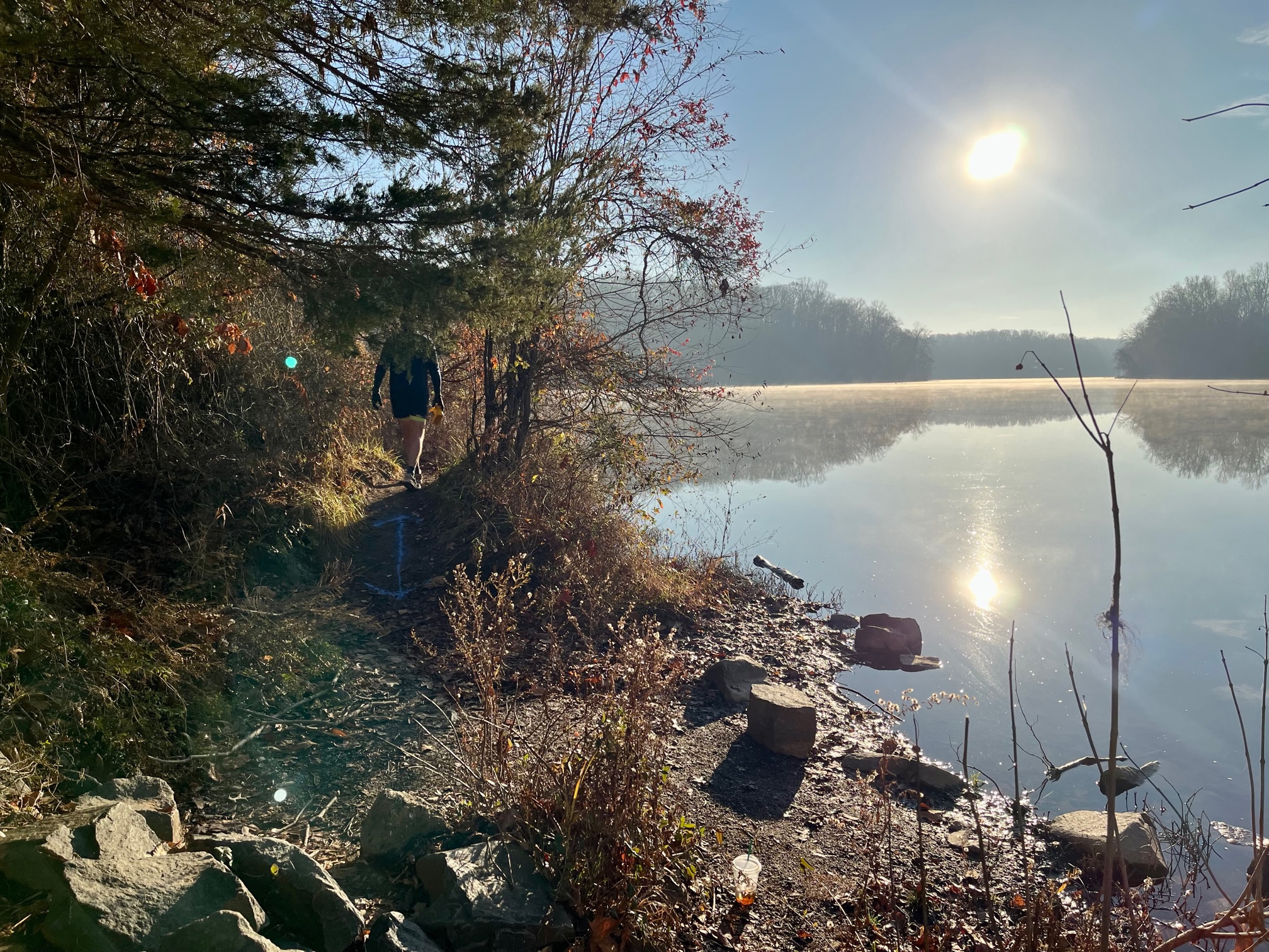 After brief remarks and the obligatory starting photo, Q officially started the race with a gentle, “go.” The chilly air warmed quickly with the warm sun, and the day could not have been better!! Whether the runners did 12 miles, 23 miles, portions thereof, or the full 50k loop (a strong group of 56!!), runners were treated to great trails and awesome aid stations (thanks Zach Weinberger and crew at Marina and Eric Levy at Fountainhead). You would think these were fully manned aid stations for a 100 miler!!!!