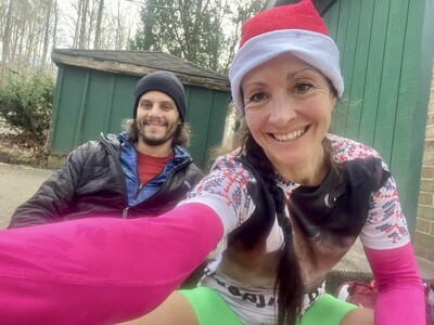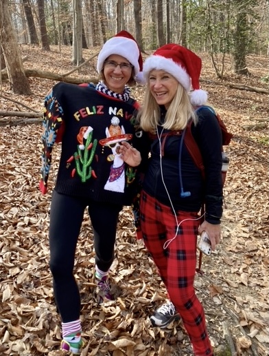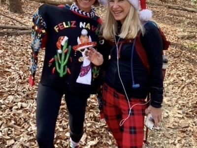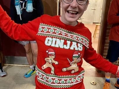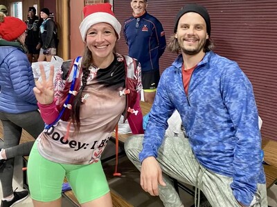 I was very sleepy. This was a busy week and Denise and I somehow got out of the house and were able to get some coffee. We made it to the race on time and we were greeted by Bob Gaylord, just firing off pleasantries at me! He was in his element directing parking. Denise and I got ready in the car then headed up to the lodge area. We saw so many friends and hilarious Christmas clothes!! It was so much fun. I didn’t even want to run, I just wanted to hang out!