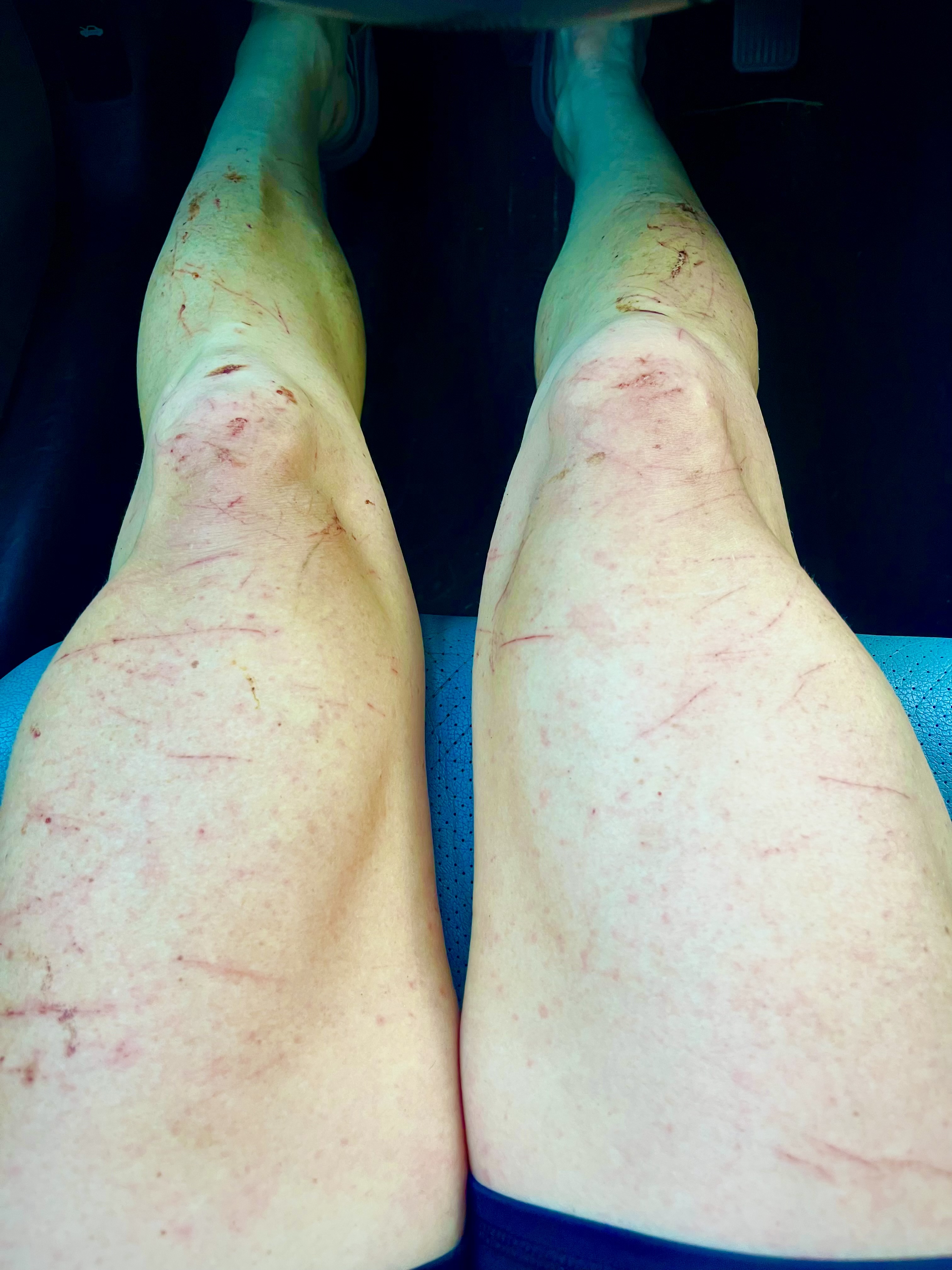 Jana survived her Three Top experience and arrived at Woodstock Tower about 3 hours after Dan. But she was still in the game and eager to press on. A photo of her eating at the Edinburg Aid Station a few miles later shows the effect of that Three Top section, as her legs looked like they had just been through the Rat Jaw powerline climb at the Barkley Marathons (see that photo in the gallery below this report; Jana supplied a more detailed image that can be seen to the left).