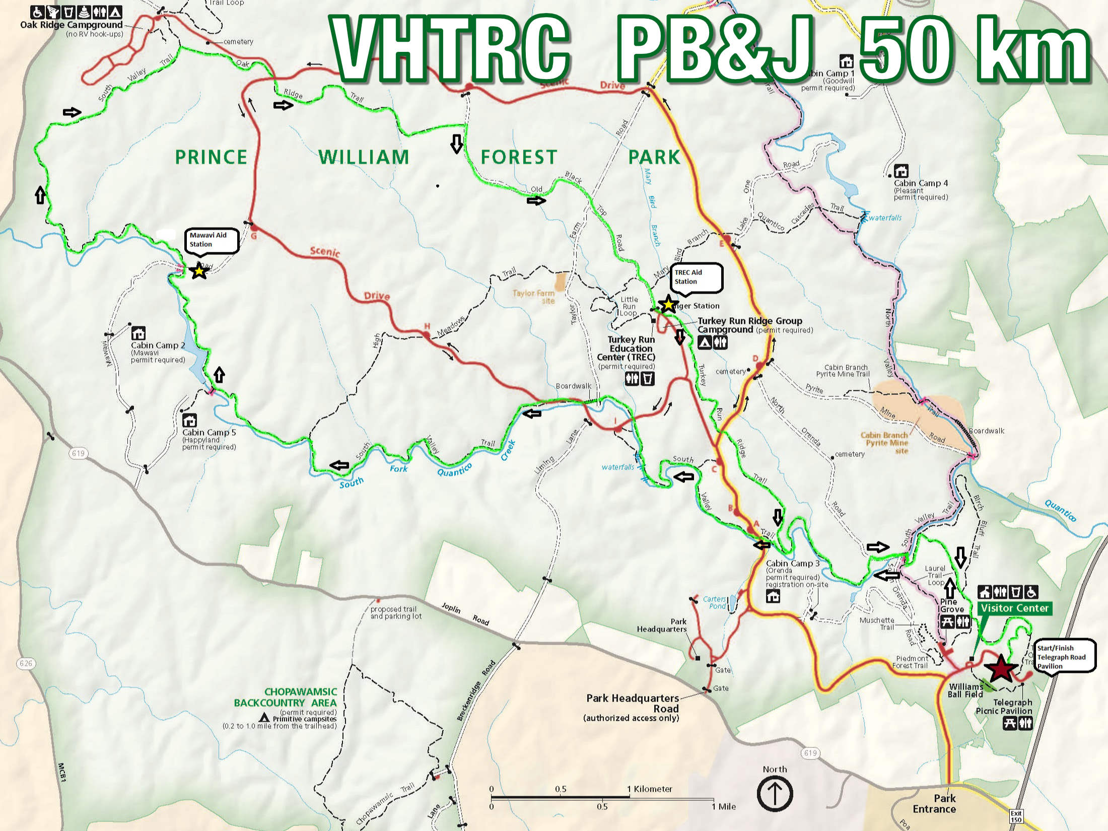 Both loops are the same; you should print out and bring with you the marked map, and the simple turn directions. Bear in mind, even though the course will be marked with blue ribbons, you should do your homework, and make yourself aware of the general nature of the course and the trails used for the PB&J 50k.