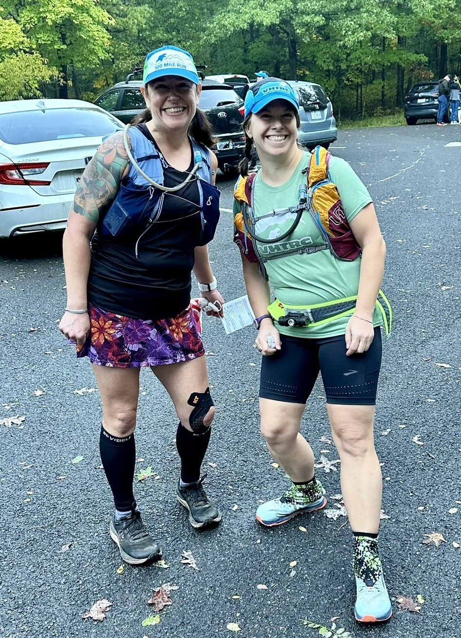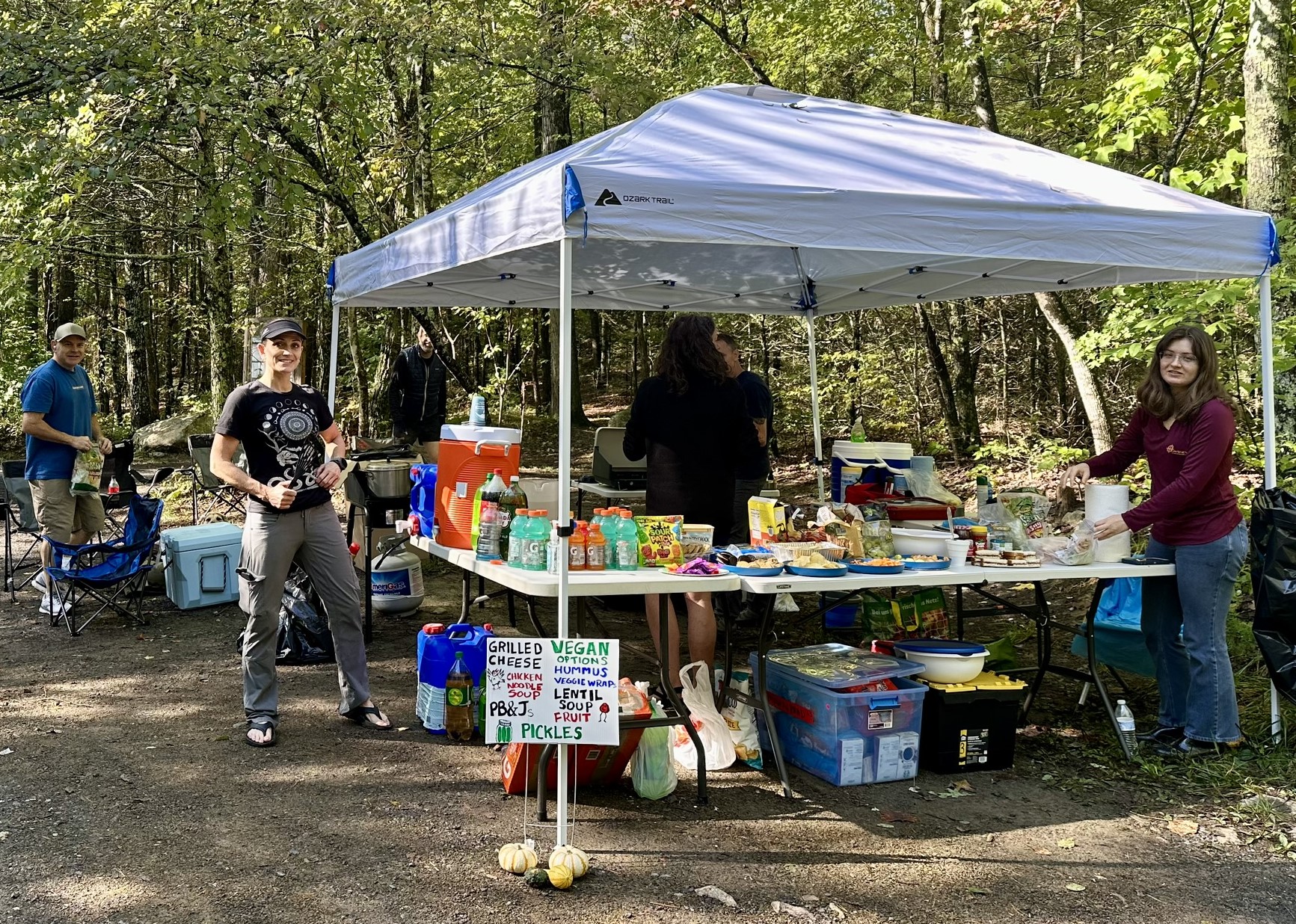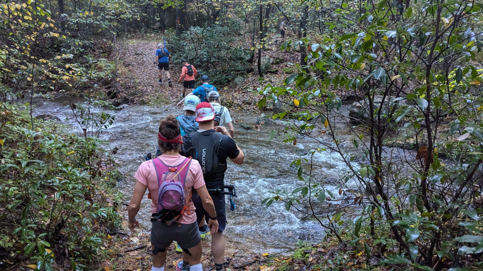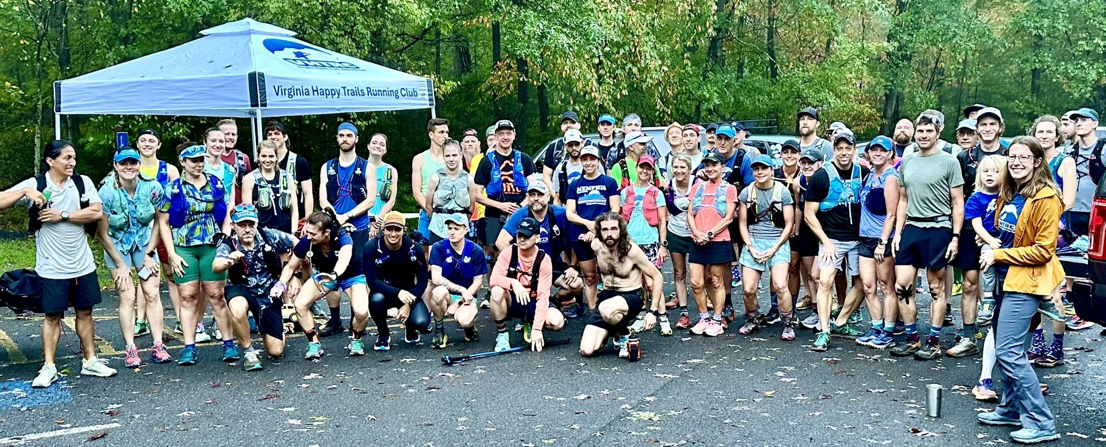 Memories of last year’s hurricane Ophelia were strong as the date of The Big Schloss 50k approached, and with it another hurricane, Helene. The PATC North Mountain Brigade had been working tirelessly for the past month to clear the trails for the run, as well as new volunteer Trey McKinnon who took down some trees found last minute to be blocking the Little Stony Trail, but no one could predict what this storm would bring. The trails were in good shape on Friday as the rains started and course markers Brian Collins, Bruce Tweedie, Jim Harris, Paul Jacobs, Sarah Curtis, and myself put up the marking flags, but later that evening the real rain began, soaking the course which had been in drought conditions for much of the year. Those who braved the storm to camp at Trout Pond Recreation Area were mostly prepared with extra canopies and umbrellas to keep their belongings dry, lessons learned from Ophelia last year, but many of the runners made the smart decision to sleep in their warm, dry beds and make their way to the start on Saturday morning. While the forecast predicted good weather on Saturday, no forecast is a guarantee in the mountains, so it was a relief when the rain finally stopped in the early morning hours.
