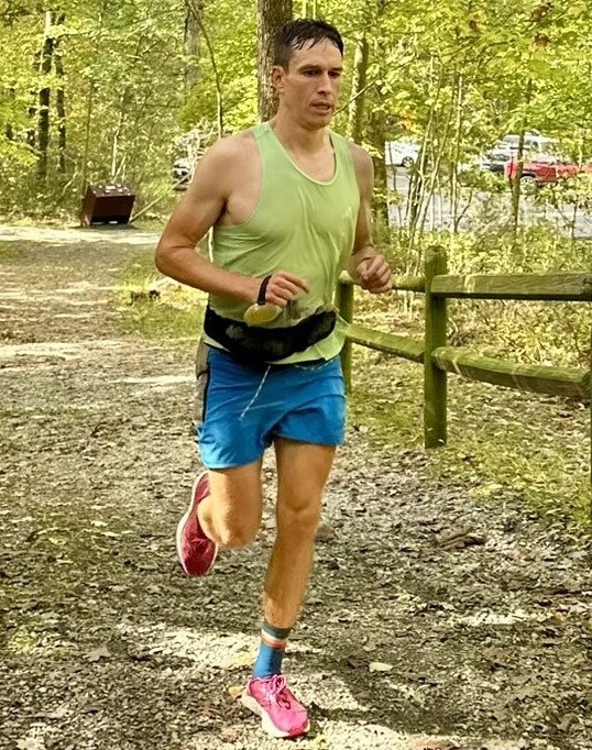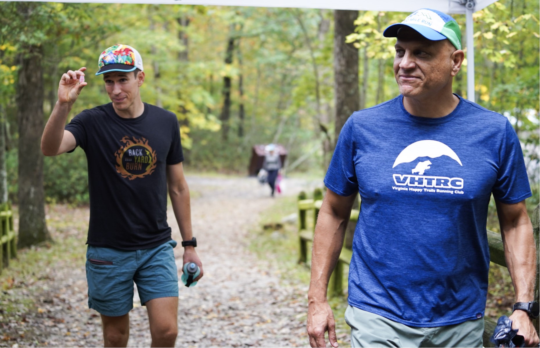 With three previous winners among the starters, as well a group of younger runners from Patrick Henry College returning (they wanted to actually get a view from The Big Schloss this year), it promised to be a competitive field. David Yoder of Harrisonburg, winner of the last VHTRC Boyer’s Furnace, took an early lead, trailed closely by last year’s winner Mark Epstein and 2022 winner Brian Collins, into the Bucktail Aid Station. Emily Lukasik led the women’s field into the first aid station. Runners were greeted by Emily and Chad Merrill and their volunteers, with delicious pancakes to send them on their way up the Bucktail Cutoff Trail.