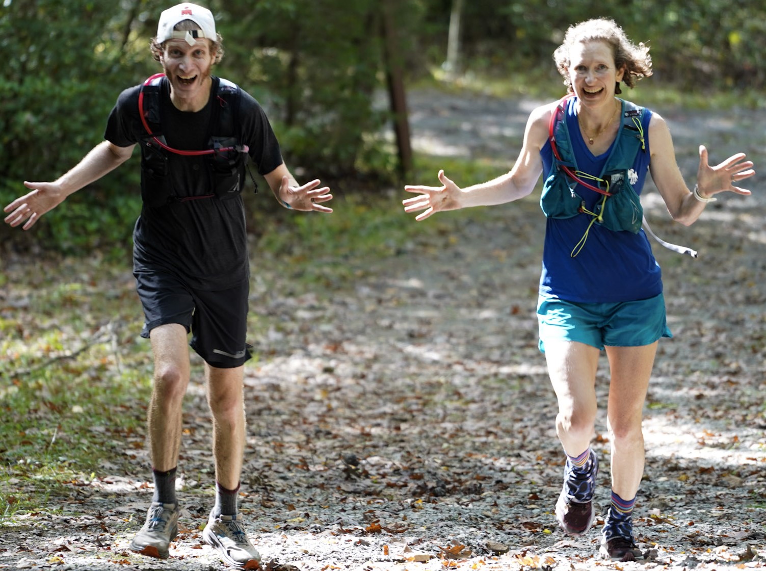 Runners were feeling good coming into Wolf Gap, having come down from Big Schloss, seeing the home stretch to the finish. They were treated to orange chicken and avocado rice courtesy of Captain Jesse Fuller and his crew and were apparently told it was all smooth downhill after Tibbet Knob. Many runners noted the climb to Tibbet was unexpectedly brutal. Brian Collins, now in second and power hiking at a good pace up the climb, was informed by passing trail runners, “You know, the guy in front of you is running this.” This was verified as fact by David Yoder at the finish, who handily claimed the first-place male finish with a time of 5:18, only 5 minutes over the course record which has stood since 2017. Brian Collins came in looking strong for second-place. Several runners found themselves cramping on Judge Rye Road which is, in fact, uphill until the rocky Long Mountain Trail descends to the Trout Pond Trail and the finish. Taking advantage of this Dennis Chavez surged ahead to third place, with Matt Burke chasing close behind, and Martha Nelson overcame Emily Lukasik for first place female and eighth overall with a time of 6:43, though Emily was able to hold off Sheila Martin in order to claim second-place female.