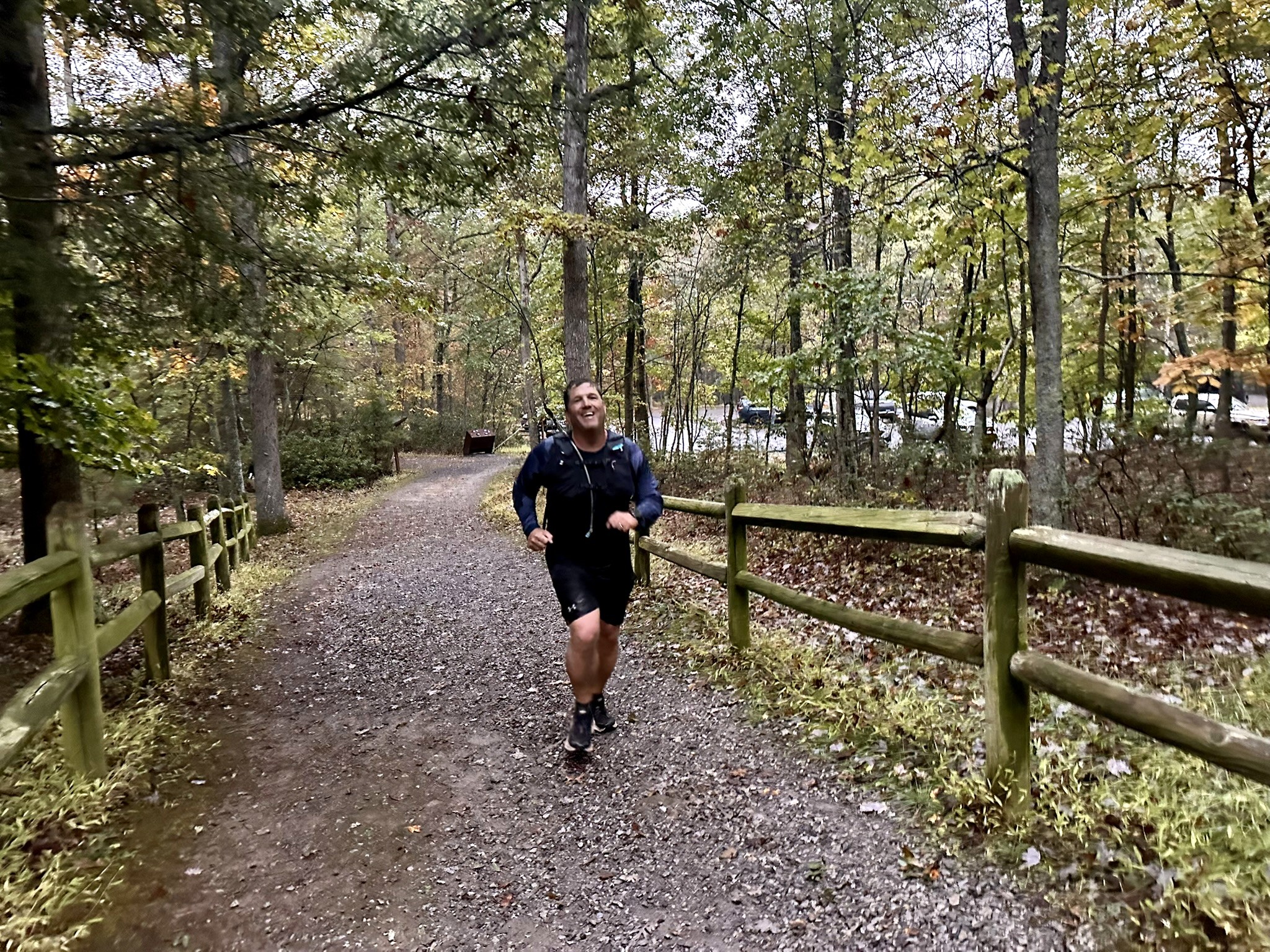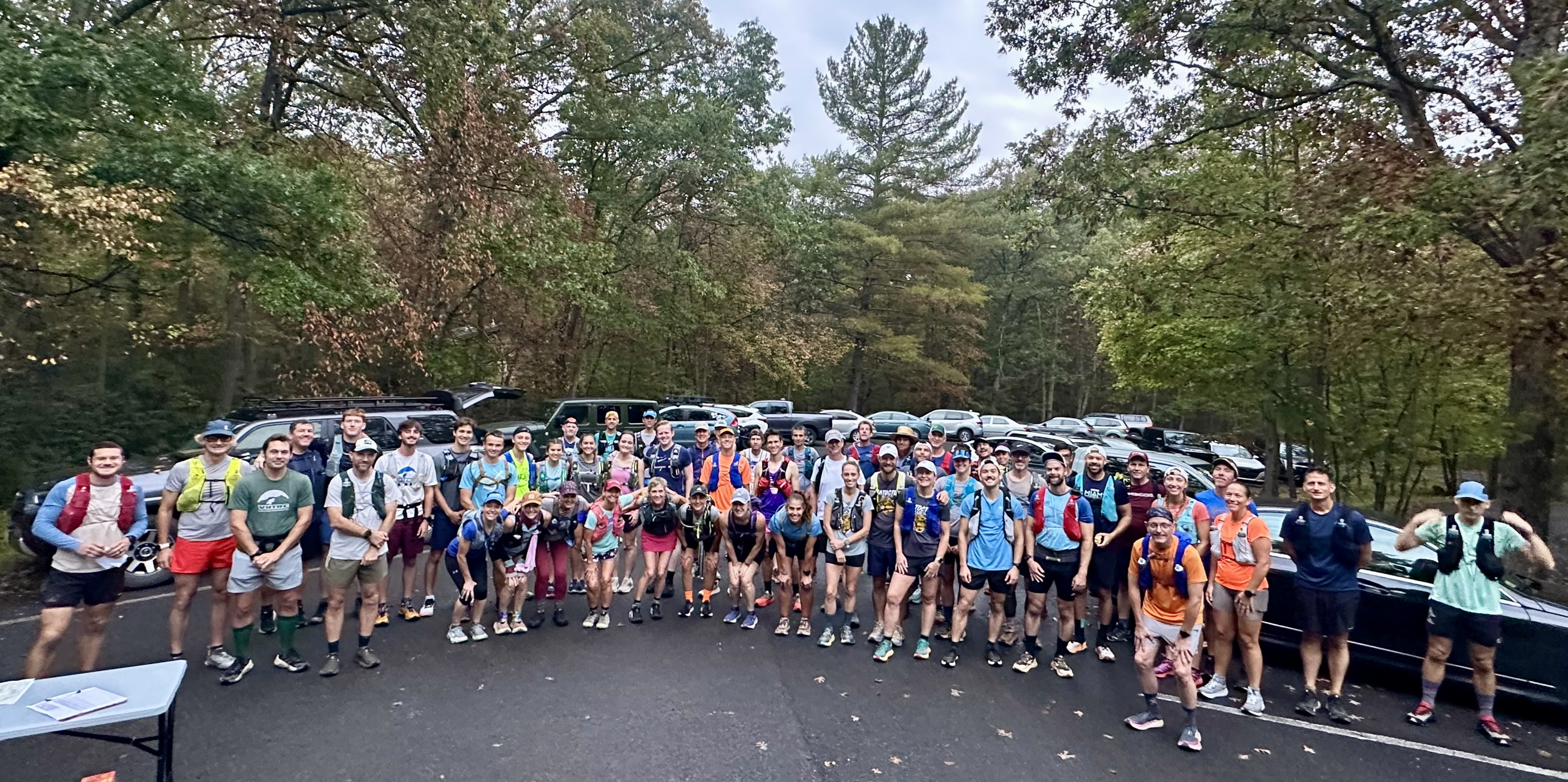 The crisp feeling of Fall has been in the air on Great North Mountain for the last couple weeks, with recent dry weather bringing changing leaves earlier than usual. Unfortunately, as has been the case for the past 2 years, the rains returned for the week of the Schloss, with a forecast of showers for the day of the run. Thankfully we did not experience the deluge that we had last year or the hurricane the year before that, with only passing sprinkles and mists keeping the day cool though still somewhat humid until a steady rain developed towards evening. The Schloss trails had experienced the same massive overgrowth seen throughout the region this year, due to the heavy constant rains earlier in the summer, but again the PATC North Mountain Brigade led by Mike Allen was up to the challenge of getting the course ready in time for the run. With several trailwork days, and the help of runners Marcia Washburn, Chris Flint, and Nathaniel Faunce, in addition to myself and Bob Gaylord, the Brigade chopped, weed whacked, raked and clipped the trails into submission. With all this work, runners commented that they were some of the most groomed and runnable trails they’ve seen all year. Many thanks to the team for the fantastic work, we are lucky to have them!