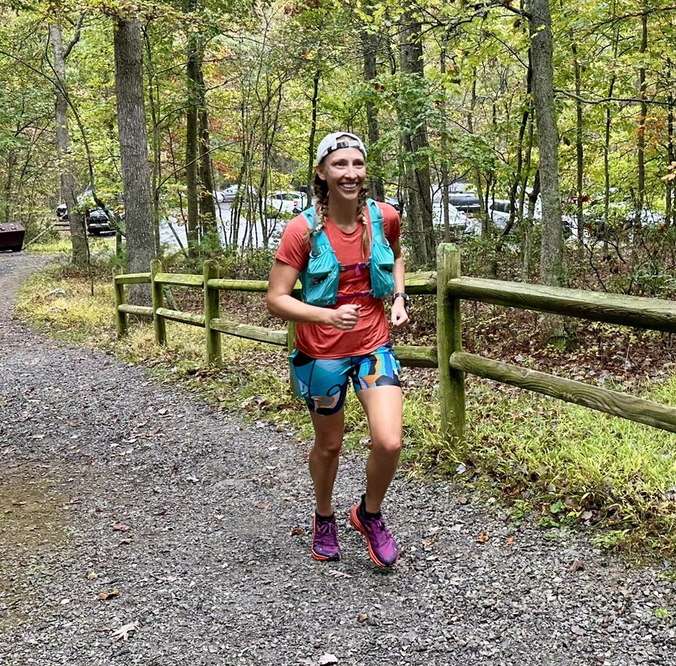 Last year’s winner David Yoder started out in the lead into Bucktail Aid Station, with another Harrisonburg area runner relatively new to Virginia and running his first VHTRC event, Lance Harden, close behind running with John Oplinger. Katie Thompson, running her second Schloss, took the lead early for the women, followed by newcomer Mary Donahue. Runners were greeted by Ivory Lira and her team, with a birthday theme in honor of volunteer Lexi DeLisle. Little Stony Creek Aid Station, organized by Quatro Hubbard, saw Lance come down the trail in front and John right on his heels, with Bradley Hawley not far behind. Despite being within reach of the lead, John was enticed by Quatro into an impressively large swig of Jim Beam, which he may or may not have regretted later in the run. Unfortunately, David Yoder limped into Aid 2 next with a turned ankle and had to call it a day but was happy to lend a hand to help runners and volunteers at Aid 3 and the finish which was very much appreciated! The ladies held steady with Katie in the lead, Mary looking fresh in second, and Lindsey Weaver starting to separate herself from the rest of the women by Aid 2. The rain became steadier by Aid 3 at Wolf Gap, led by Jesse Fuller who cooked up some expertly seasoned fried rice, and The Big Schloss could be seen draped in clouds. Luckily most runners reported that the views were still dramatic from the top and not socked-in for the most part. The climb out of Wolf Gap up to Tibbet Knob caught some runners off guard as Aid 3 volunteers have been known to advertise that the course was “all downhill from here.” Caroline Prendergast was among the runners surprised by the steep ascent and rock scramble, remarking at the finish, “Who put a little bit of Old Rag in at the end there??”